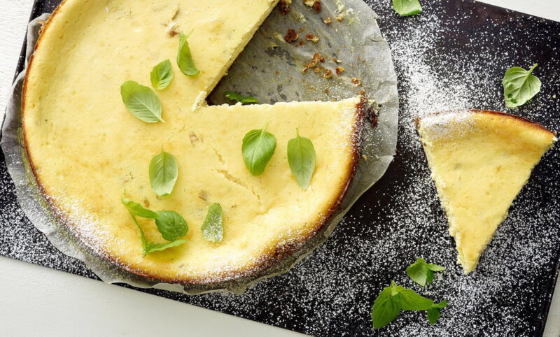 - Sekoita munat, kermaviili ja mausteet tasaiseksi seokseksi. Hienonna basilika, lisää munakasmassaan ja kaada se vuokaan. Ripottele juustoraaste pinnalle. Kypsennä 175-asteisessa uunissa noin 25–30 minuuttia.