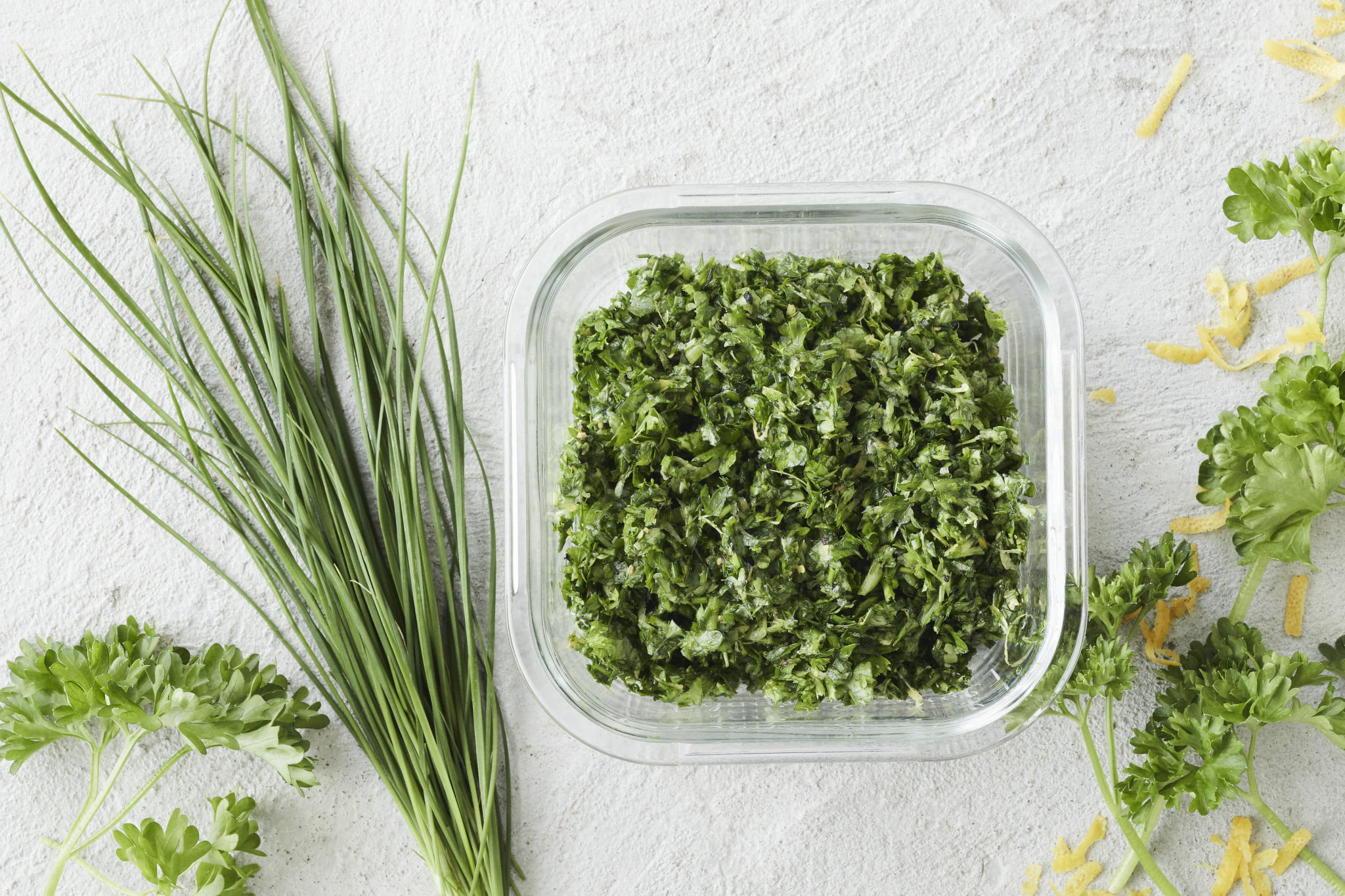 - Hienonna persilja ja valkosipuliruoho. Lisää sitruuna kuoriraaste ja oliiviöljy silppuun. Mausta suolalla ja ripauksella mustapippuria.
