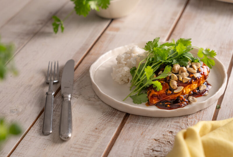 2. Leikkaa broilerifileet annospaloiksi ja laita kulhoon. Silppua valkosipuliruoho. Laita silppu, broileripalat, juustokumina, suola, pippuri, hunaja, öljy ja seesaminsiemenet kulhoon ja sekoita. Anna maustua.