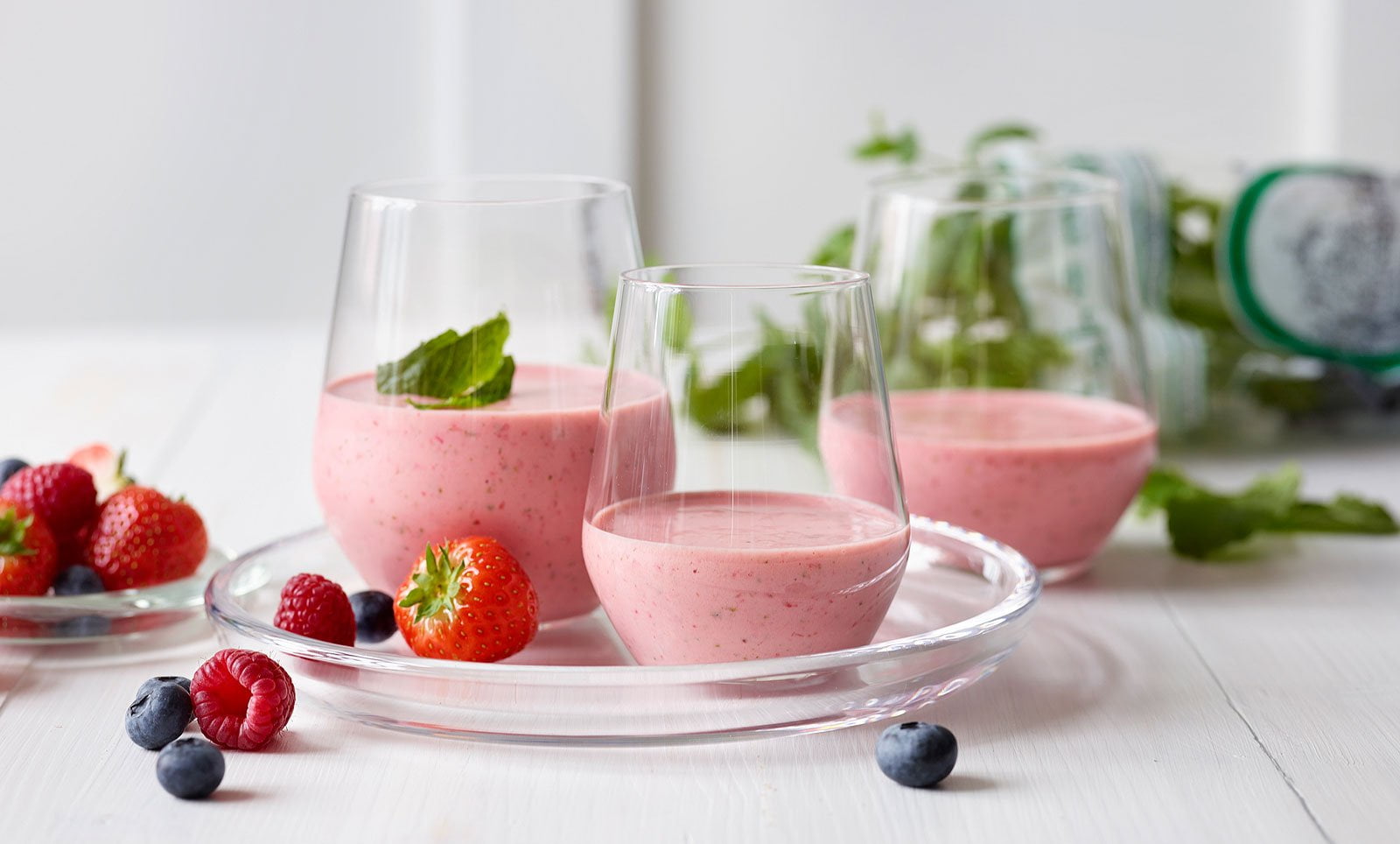 Raikas mansikka-minttusmoothie, jossa on Järvikylän vahvaa minttua tai basilikaa. Valmista 5 minuutissa!