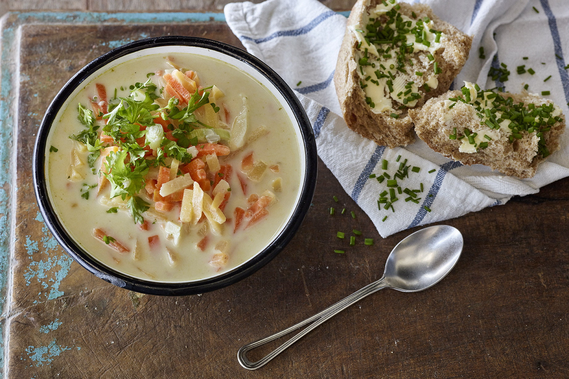 - Laita vesi, pilkottu sulatejuusto, murennettu liemikuutio ja