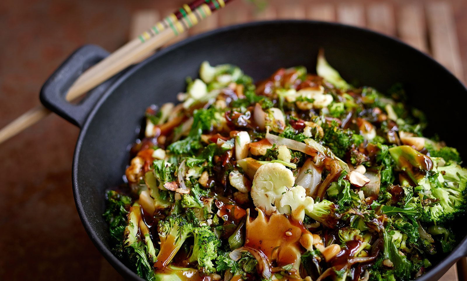 2. Kuumenna öljy vokkipannussa. Lisää sipuliviipaleet pannuun ja paista niihin hiukan ruskeaa väriä, lisää kaalisuikaleet ja anna niiden paistua yhdessä sipulien kanssa noin 5 minuuttia, pöyhi välillä. Lisää kukka- parsakaaliviipaleet ja jatka paistamista vielä 7–10 minuuttia, silloin tällöin kasviksia pöyhien.