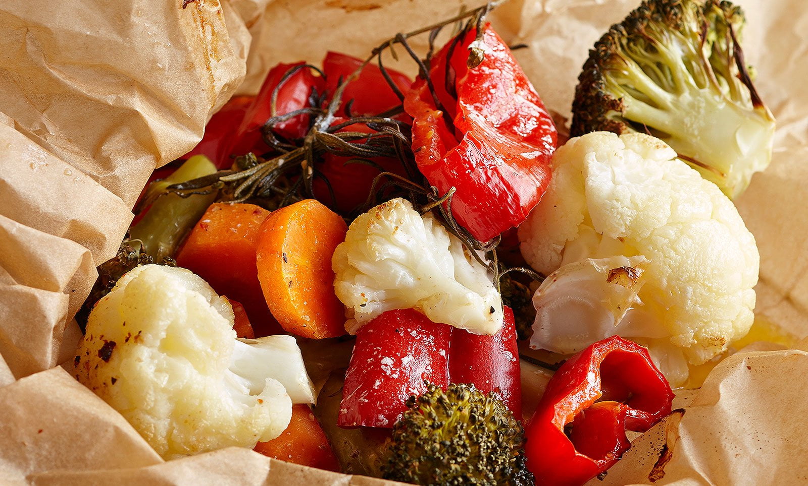 - Paloittele esikäsitellyt kasvikset ja jaa palat leivinpaperiarkeille. Mausta kasvikset yrttisuolalla ja jaa maustevoi sekä rosmariinin tai laventelin oksat päälle. Rutista leivinpaperit nyyteiksi ja sido narulla.