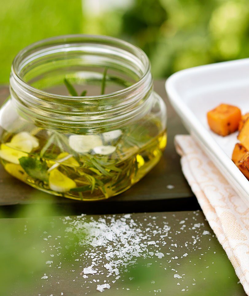 - Silppua rosmariinit rouheasti varsineen. Painele silppua veitsen lappeenpuolella tai hiero silppua nyrkeillä painellen. Laita silppu ja jääkaappikylmä voipala kattilaan, kuumenna avoimena, miedolla lämmöllä (säätö 1-2) kunnes voi on kokonaan sulanut. Kuori lämmityksen aikana pintaan nouseva vaahto pois. Siirrä kattila liedeltä, anna heran ja yrtinoksien painua pohjaan. Valuta kirkas rasvaosa rasiaan.