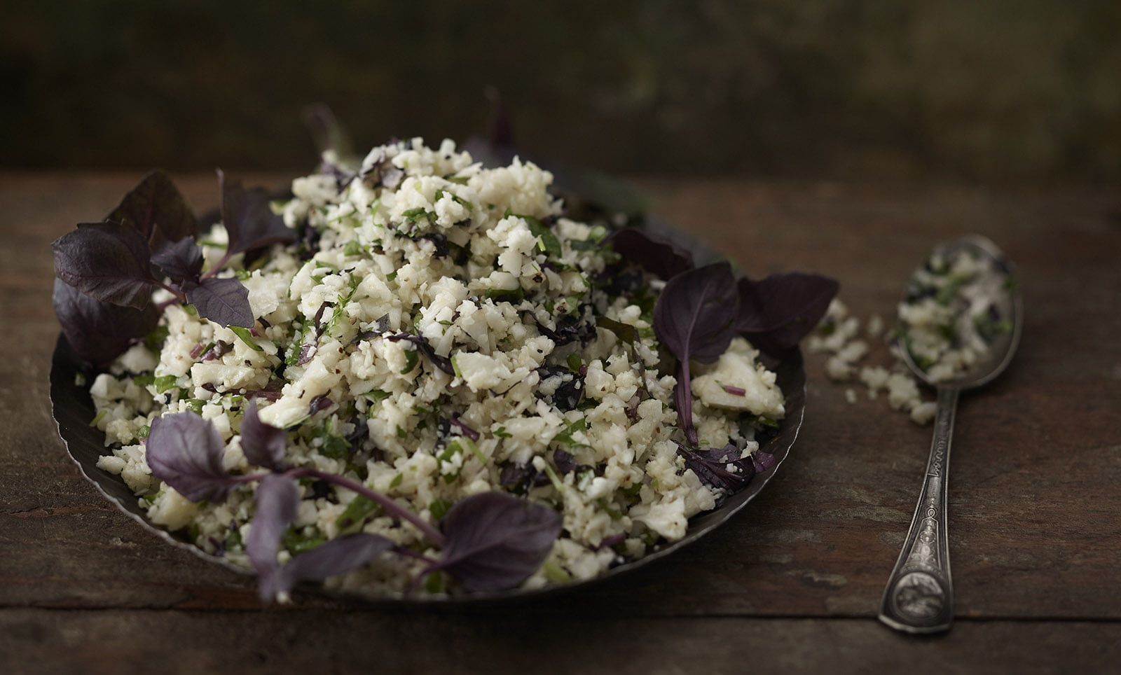 - Murusta kukkakaali monitoimikoneessa. Kuumenna öljy, suola ja mausteet laakeassa pannussa, lisää kukkakaalimuru ja anna sen hiukan rapsakoitua. Silppua yrttien lehdet joukkoon.