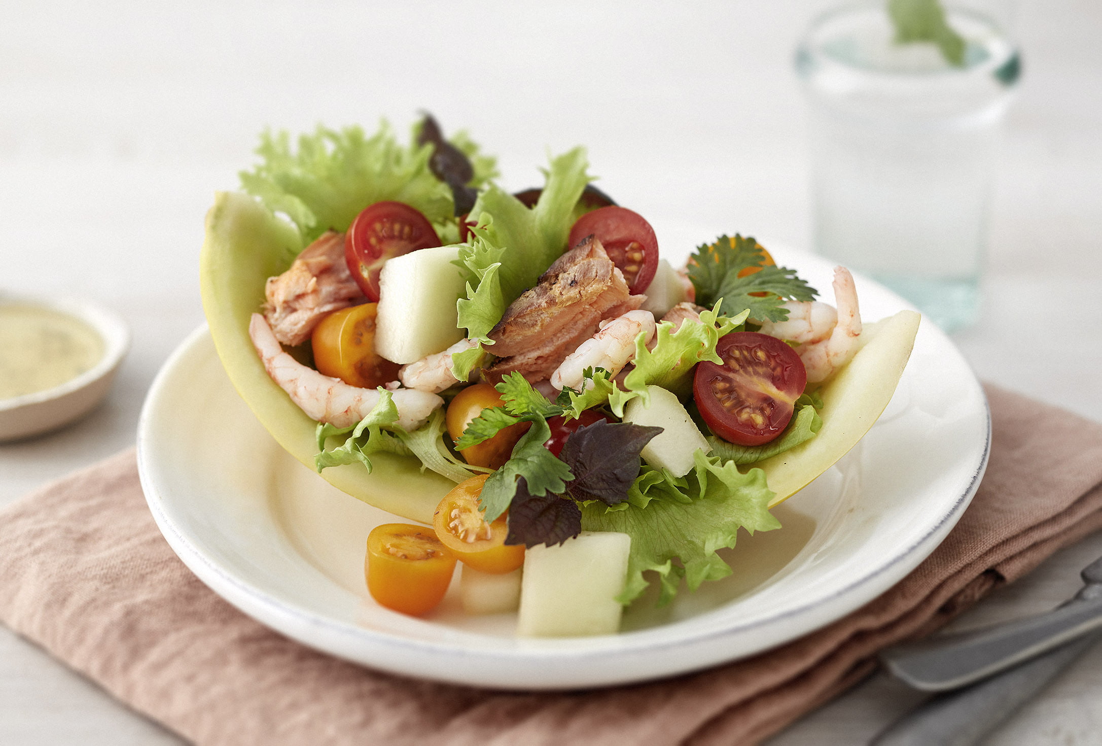 - Pese ja linkoa salaatinlehdet, huuhtaise kirsikkatomaatit ja halkaise ne. Valuta sulaneet katkaravut. Lohko hunajameloni ja kuutioi kuoresta irrotettu hedelmäliha.