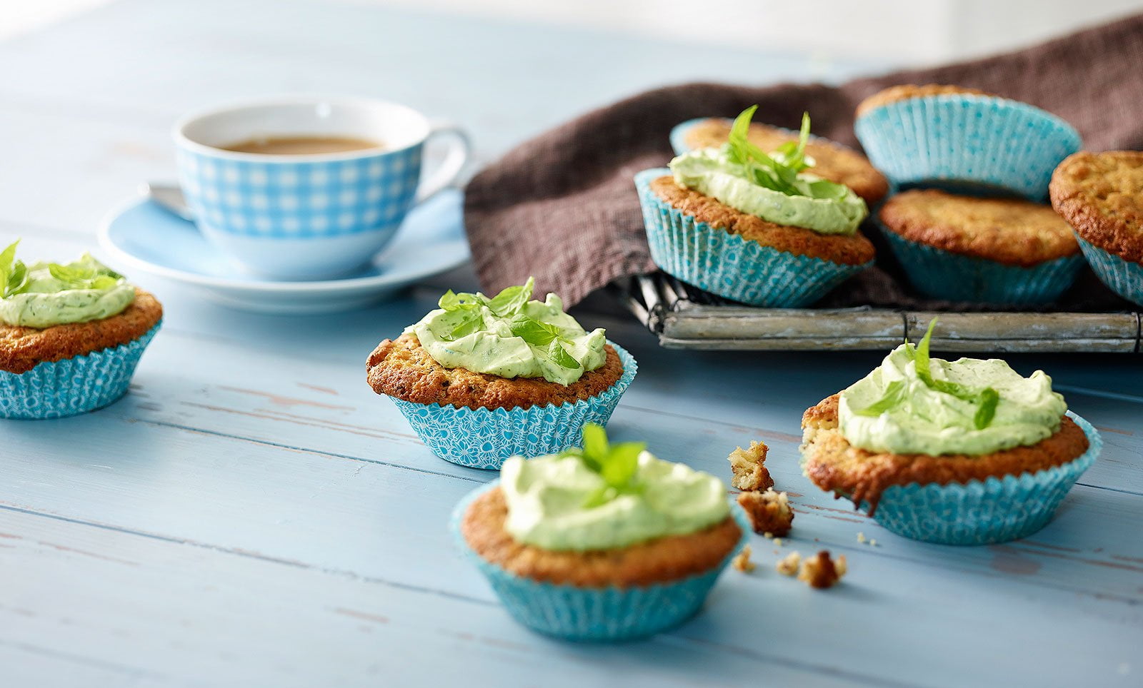 - Levitä kuorrutus haaleiksi jäähtyneiden muffinien päälle ja koristele muffinit lopuilla mintunlehdillä.