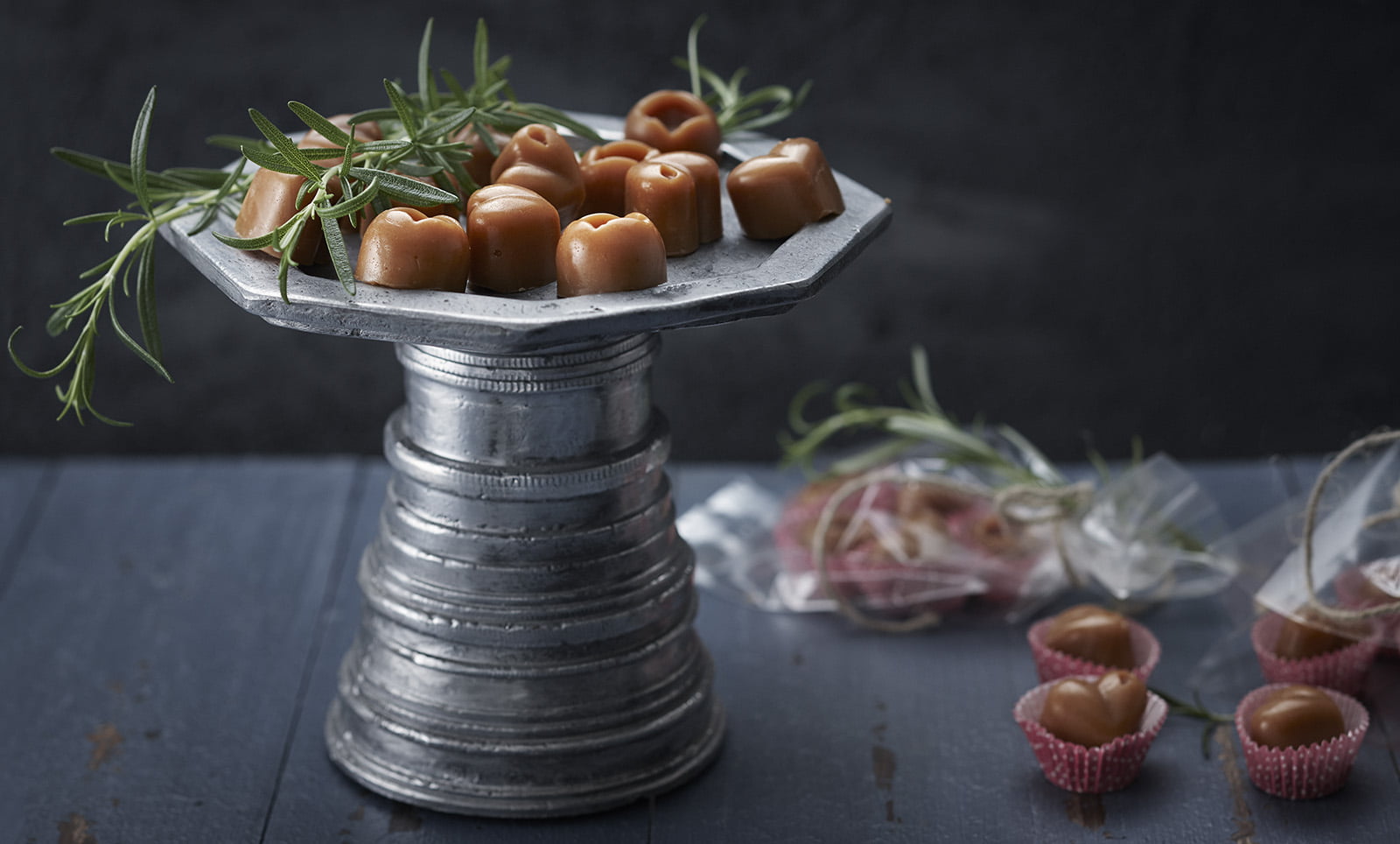 Rosmariini ja kanelitanko tuovat toffeeseen jouluista makua. Kauniit toffeet sopivat pieneksi jälkiruoaksi ja kahvipöytään, ja ovat myös ihana tuliainen.