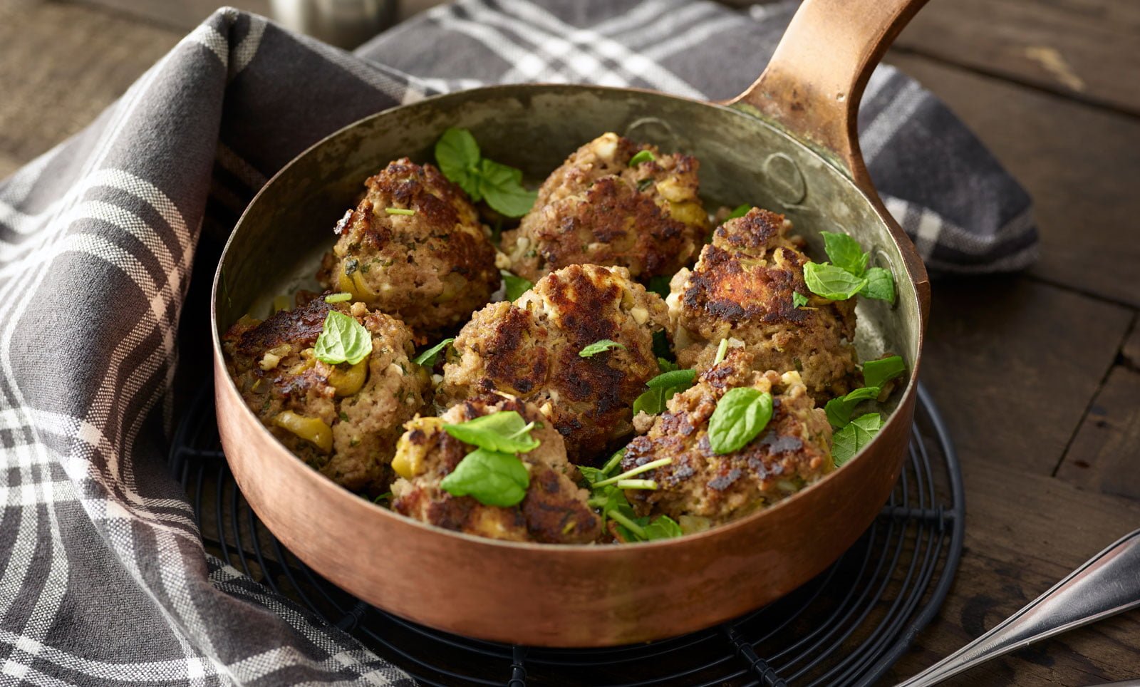 Tuoreet yrtit ja feta vievät lihapullat välimeren tunnelmiin. Paista kerralla isompi satsi ja nauti vaikka tuoreen salaatin kera.